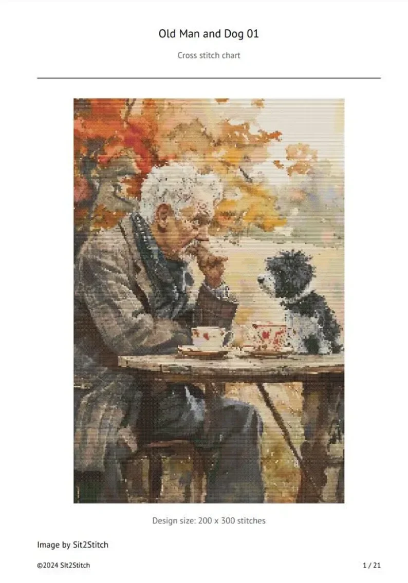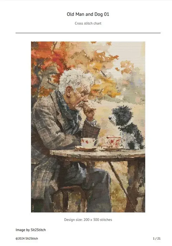Old Man with Dog Cross Stitch Pattern.60,000 StitchesStitch Count 200 x 300125 DMC ColoursPattern Keeper compatible© Sit2Stitch
