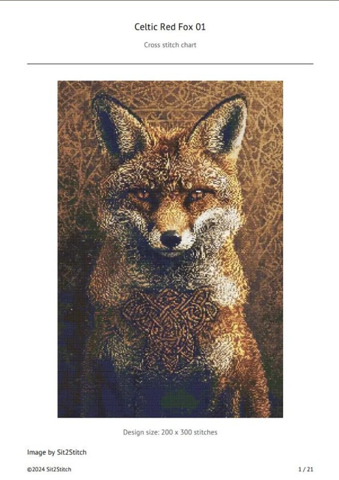 Celtic Red Fox cross stitch pattern.PDF Downloadable Cross Stitch Pattern60,000 StitchesStitch Count 200 x 30099 DMC ColoursPattern Keeper compatible© Sit2Stitch
