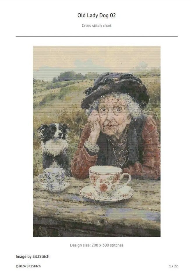 Old Lady with Dog Cross Stitch Pattern.60,000 StitchesStitch Count 200 x 300146 DMC ColoursPattern Keeper compatible© Sit2Stitch